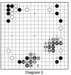 Diagram 2 (28-47) (black 35 is where the marked white stone is): Since Black had not forced the 37 for A exchange, White could wedge in with 28 to invoke a ladder. Since Black resists with 29 through 35, White can capture Black's marked stone in a ladder. This looks terrible for Black. However, Black has a greater plan that becomes apparent when he plays at 37, a ladder breaker. He hopes White will answer at A as he can then pull out his marked stone. See Reference 2.