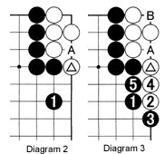 Diagram 2: This white group seems to have two eyes. However, after black 1, the marked white stone will eventually run into trouble and get caught at A.
