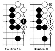 Solution 1A: Black 1 is correct. White can capture with A or try to move out with B, but eventually his marked stone will be put into atari (see Diagrams 2 and 3) and it becomes clear that White has one real and one false eye.