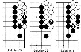 Solution 3: Black should play at 1. White can capture two stones by first playing at 2. However, black 3 reverts back to a situation similar to the one in Solution 2A. White's stones will be captured.