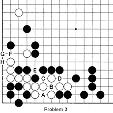 Problem 3: This situation is a part of a game between 4-dan and 5-dan pros. As you see, false eyes can cause problems for professionals, too. A is an eye for White, but B is not. If White plays at F, black G, white H and black I will follow, preventing White from gaining an extra eye. However, White has an escape route after this exchange. Where should Black play to prevent this escape and make sure he can play at D if White plays at C? There is only one way to kill White.