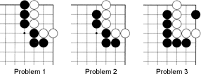 Problem 2: This is similar to Problem 1, but White has an extra liberty. This changes things a bit and Black cannot use the same method. If Black plays first, where should he move and what is White's best response?