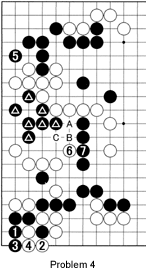 Problem 4: This is an interesting problem from a game on TV between two top pros. The combination of black 1 and 3 was a brilliant defense against the threat of white A, followed by black B and white C, after White has exchanged 6 for 7. Black did not feel like defending against the cut at A. Keeping in mind that the players have only 30 seconds per move, he came up with the great combination of 1 and 3. Let's see how this works next week.