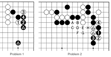 Problem 2: After the last white move in Diagram 1, Black can play at 1. White counters with 2 and 4. However, Black can now capture the two marked stones in a ladder with H. Before playing 2, White should first make preparations to invalidate that ladder by playing a move that threatens to cut at A. All the moves B through G threaten to cut at A. Which move also breaks the ladder to allow White to play at 2 and 4?