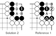Reference 1: Black 1 is no good as white 2 puts him on the spot. This move aims at A killing the marked stones. Black's last hope is B to make a ko. However, White captures with C and Black has little hope of winning this ko. Even if he did, it is better to live without a ko as in Solution 2.