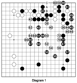 Diagram 1: Black had to answer white 36, last week's final move, with 37, allowing White to break through on the right side with 44 through 48. In the center, White also takes the initiative with 50 and 52, and with 54 sets out to build a huge framework to claim the upper quadrant. Just in case, white 58 and 60 prepare to make an eye with A, followed by black B, white C.