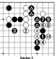 Solution 2: Black 1 is dangerous. White 2, threatening to cut, prompts black 3. White 4 and 6 now are a destructive combination. If Black wants to save his marked stones, 7 and 9 are the right moves, but white 8 and 10 capture two black stones, devastating Black's position. Note how white 2 defends his marked stones against a ladder.