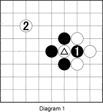 Diagram 1: This is a ko situation. The white marked stone is in atari, meaning Black can capture it on his next move by playing at 1. White cannot capture the marked stone immediately because of the ko rule. He must play elsewhere, allowing Black to decide whether to answer that move or connect the black stones by playing where the white marked stone had been.