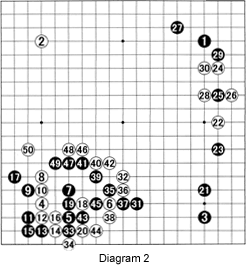 Diagram 2: This is the game that was declared forfeit. It was played between the current Meijin, Norimoto Yoda, and O Meien, a former Honinbo. Yoda is Black.