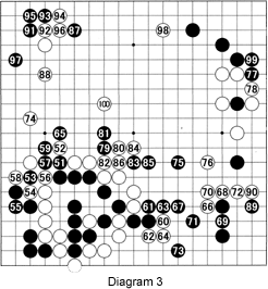 Diagram 3: However, with a tremendous combination and sacrificing one stone, Black forces his way out with 53 through 59. White 60 is a smart move as it gives him a base in the sequence through 64. Black 65 however, gets a good grip on the outside. White 66 takes aim at four black stones to the left. Black immediately defends with 67 through 73, but at the cost of White cutting through with 70 and 72. Black 79 through 85 keep White weak. Before deciding how to continue the attack, Black first makes territory with 91 through 97, and then with 99. Next week we will look at the ko situations.