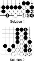 Solution 2: White 1 is a clever move. After white 5, Black cannot connect at 1 and A at the same time. Note that black 4 is necessary because White can cut there if Black connects at 1 and A.