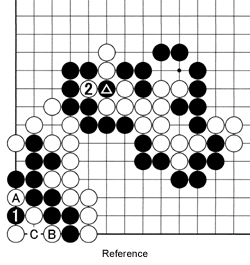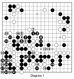 White 2 builds territory at the top but his center stones are in danger. He tries to rectify this with 4. However, black sets up a ko with 7 and 9. After white 10 captures the ko, black 11 creates a lot of ko threats. White mistakenly believes he can ignore the threat, so he plays 12 and 14. This is another mistake as Black can cut with A, followed by white B and black C. White would have to fill in the ko (where black 5 was captured earlier), but then black D would bottle up 12 and 14. Black ignores White's mistake for the moment and kills White's entire group in the lower left. White's moaning could be heard on TV when he realized his mistake. However, he seeks revenge with 24 and 26. Black falls for it by playing at 27, leading to a double ko in the sequence through 35 (see Reference 1). White 36 puts a black stone in atari.