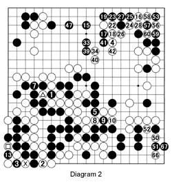 The double ko in the lower left corner means White has an unlimited supply of ko threats and he cannot lose the ko in the center (the stone with the triangle). Occasionally, however, this ko is fought over to gain more time. As he is sure to win the center ko, White tries to turn the entire center into territory with 4. Remember, White only wins the center ko by virtue of the double ko in the lower left. Black invades with 15 and White with 16. Black ensures he will live in the sequence up to 47 while White seizes the upper right corner. However, black 53 through 60 start another ko. All ko situations are too important to lose so the players keep going back and forth with moves 68 through 77. Black 77 repeats the board situation and the game is declared forfeit.