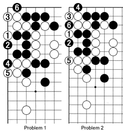 Problem 1: This situation is part of a joseki. White can now play 1 and 3 hoping to fool Black. Black 4 and 6 is the correct response. Why?
