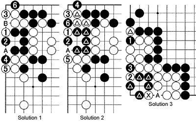 Solution 2: Black should not play at 4 immediately. White 5 is a strong move. Black can capture with 6, but it is a ko and the ko is not direct--Black's marked stones are not in atari while White's are. But if White has a lot of ko threats and Black only a few, White can eventually ignore Black's non-ko threat and approach with A, putting the heat on Black's marked stones. Then if Black loses the ko, Black's marked stones die while White's live. Black should follow Solution 1.