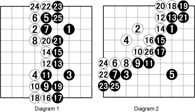 Diagram 1: This is a game between two beginners. Black plays conservatively on the 3-3 point while White ventures a little farther away from the corner to the 3-4 point. Black expands his territory with 5 and 7 and later with 9 and 11 but White just keeps defending his turf. In response to white 16 and 18, Black has to defend with 17 and connect with 19 to prevent 17 from getting cut off. Black now has 27 points against White's 29. So White wins. From the outset, Black played too conservatively.Diagram 2: After only five moves, Black occupies three corners while White has one. White keeps expanding and defending his corner, but cannot compete with Black. White ends up with 20 points while Black has 35 points. It is obvious White did not use his stones efficiently.