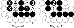 Diagram 6: Territory in the seki in the upper right is not counted so neither player scores points here. Black 1 is not a good idea, although it does not cost him any points. It looks as if he can kill the two marked white stones. But White is ready to play at 2. Black has no choice but to capture with 3. This gives him four points, while white 4 captures the two marked black stones, also worth four points.