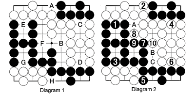 Diagram 3: So what happens if each player prevents his opponent from making additional territory? That is what happens up to move 6. Notice that neither black nor white groups in the center have two eyes. Black sets out to make eyes with 7. White 8 takes away a point before making one with 10. A through I are dame points. Both players end up with five points.