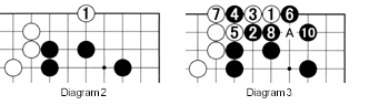 Diagram 3: (White connects 9 at 4) There are various ways to stop the intrusion. Black 2 through 6 is a good combination. White has no choice but to capture with 7, then connect with 9. Black safeguards his territory by playing at 10.