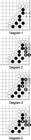 Diagram 2: We have seen what happens when we play the monkey jump at 1. We also know we can stop this with 2 and 4. The sequence through 8 is natural. Even if White had played in reverse 3 first then at 1 (a small monkey jump instead of a large one), Black would have still played at 2 and 4, ending with the same result.