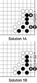 Solution 1A: In response to 1, black 2 is best. After White pulls back with 3, exchanging black 4 for white 5, before defending with 6 takes away a possible point for White at A (otherwise he may play at 4 at some stage).