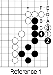 Reference 1: What if White draws back with 3? He can defend at B, followed by black C, white A, but that leads to gote. On the other hand, if he plays elsewhere, Black will play at A, followed by white B and black C. Defending with white D would lead to gote. But if White ignores this situation, Black can play at D, followed by white E, a black connection at 3 and white F. This gives Black just as many points as in Solution 4, but White gets two fewer points (at E and F). In other words, White should follow Solution 4.