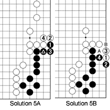 Solution 5A: After the marked stone, Black can force the sequence 1 through 4 in sente.