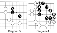 Diagram 4: White can threaten, starting with 1 and 3, and Black has no choice but to defend all the way to 12, or else his group dies. Black has lost a lot of ground--his corner territory is only about 12 points.