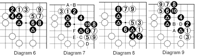 Diagram 6: Going back to our first situation, White could also strike at 1. This looks like a strange move as it can be cut off. But note what happens. After the sequence through 9, White is alive and Black may die.