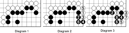 Diagram 3: This sequence with White playing atari at 1 and nose-tesuji at 5 is an improvement, but he can still do much better. Note that White can change the order of 1 and 3.