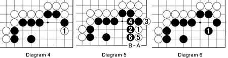 Diagram 6: Considering the preceding diagrams, Black will usually defend at 1 at an early stage.This is worth more than 10 points in reverse sente, which is usually thought to be twice the value of an ordinary gote move. In other words, black 1 is worth more than 20 points. It is probably best playing this move during the middle game.