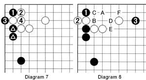 Diagram 7: Here, Black plays 1 as a probing move. In response, White can answer with 2, but then he is forced to connect with 4 after Black plays at atari with 3. In addition to reducing White's territory, Black also slightly strengthens his two marked stones.