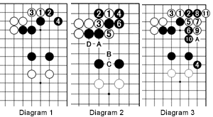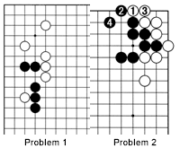 Problem 2: This is a problem for more advanced players. White can play 1 through 4 in sente. However, at an earlier stage, if it had been Black's move, how could he have prevented this? Hint: Use your knowledge of oki-tesuji.