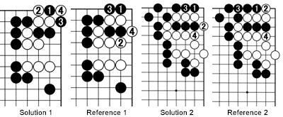 Solution 1: In response to Black's oki-tesuji placement of 1, white 2 is a mistake. Black can now play at 3 to start a ko. Of course, White may take the ko first with 4, but if he loses it, his entire corner will die. On the other hand, if White wins the ko, the result is only a few points better than in Reference 1, which provides the correct answer for White. Incidentally, a ko in which one person has a lot at stake and the opponent has almost nothing to lose is called a hanami ko, which translates as "flower-viewing" ko.