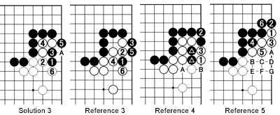 Reference 4: Playing tenuki after 6 in Solution 3 may seem strange. Let's have a reality check. If White plays at 1 and 3 to capture three stones, he has six points, including A and B.