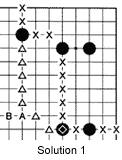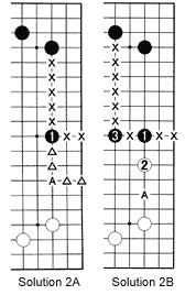 Solution 2A: If Black plays at 1, the crosses define the new borders. As we found out last week, the shimari in the upper right is worth about 8-10 points. After black 1, his territory is worth about 23 points. In addition, he can advance to A and expand his territory to the triangles, for an extra six points. Furthermore, he prevents White from doing the same.