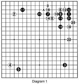 Diagram 1: The moves 6 through 15 are a popular pattern among young pros these days. White 18 aims at Black's upper right corner group. Black concedes with 19. He could have played more aggressively. However, White is now forced to make a base on the right with 20 and 22. Black's corner group is not completely alive, but that is a trade-off to get sente (take the initiative). Where should Black play next?