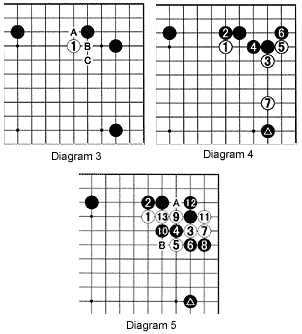 Diagram 5: Black can also play at 4, but 5 is a good response. Black's effort to capture with 6 and 8 spells trouble because of the sequence 9 through 13. White A and B are dangerous threats now.