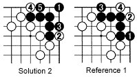 Solution 2: Black 1 is correct. White 2 and 4 are rebuffed by 3 and 5. Black has gained two eyes.