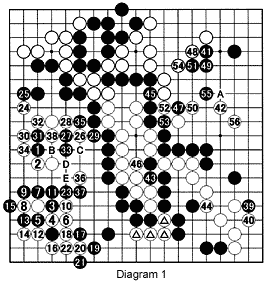 Diagram 1 (1-56 represent moves 107-162): Playing at A would probably give Black the lead. However, since White is thin on the left, Black wanted to decide the game once and for all and starts pushing him around with 1 and 3. Yamashita resists with 4. Relying on his center strength, Black presses his luck with 5 and 7, but White easily copes in the sequence through 22. In the analysis, there were some hairier variations, but each time, the marked stones were able to escape. With 29, Black once more presses hard with the intention of grabbing the entire left side. But after trapping two black stones, White easily survives up to 38. If black plays at B, White would respond with C, followed by black D and white E.