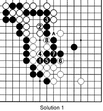 Solution 1: Cutting with 1 is not dangerous as White can easily live with the combination 2 through 8. Black even has to defend against the cut at A.