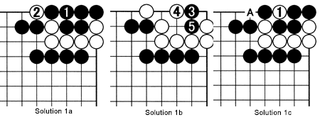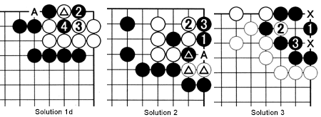 Solution 3: Black 1 is unexpected but correct. In response to 2, black 3 ensures life with two eyes (at the marked spots).