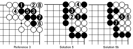 Solution 5b: This leads to this position. The throw-in at 5 is the key, leaving White with no option but to capture at 6. Black 7 turns this white space into a false eye. White is dead.