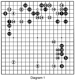 Diagram 1 (1-42): White 8 is not too good. Backed by his strength in the lower left, White perhaps should have played a pincer at A or an attachment at 35. Black is happy with the play up to 13. After 15, white B would be a joseki, a standard corner exchange, but then all his stones are very low. As he does not want to play here, Lee goes all out with 16. What he is saying is: "Come on and do your worst!" Of course, Black tries to do just that with 17 and 23. However, white 24 is an interesting move. A lesser player would try to invade at C at some stage so as not to induce Black to defend at 25 and 27. However, as a follow-up, white 28 is a good move. See Problems 1 and 2.