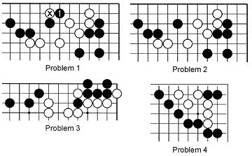 Problem 3: Black's stones in the corner are in trouble. The only way to save them is by connecting them to the outside. How can he do this?