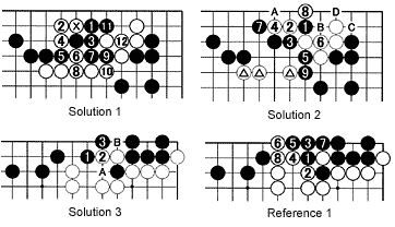 Solution 2: Black 1 is the vital point. If White tries to counter with 2, he will get clobbered. After 9, White's marked stones are adrift. On top of that, Black can exchange A for B and C for D. White is alive but with just three points of territory.