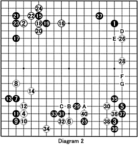 Diagram 2: To demonstrate the keima in a real game, let's have a look at the JAL Women's JAL Haya-go (Lightning Go) Championship between Yoko Inori and Narumi Osawa (white) that was broadcast early Sunday morning on TV Tokyo. These are the first 40 moves. The moves through 28 are unremarkable, but then Black plays a keima at 29. This leaves behind a cut (at 40), but this time, the ladder is bad for White. Instead of 29, Black could have played at A, which might be followed by white B, black D, white E and black F. This would be a good result for Black. However, White may not answer at B. He probably would extend to G. Black no doubt thought 29 would apply pressure on White, and his opponent would answer at C, followed by black D, white E and black F. However, White strikes at 30, an extremely aggressive move that is aimed at cutting at 40. Black refuses to defend against this move. Instead she forces White into a low position with 31 through 34, then cuts off White's escape route with 35. White reinforces with 36 through 39, then cuts with 40. This is the tsume-koshi cutting technique. Let's see how Black responded.