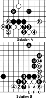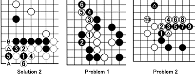 Problem 2: Black 1 and 3 cut off the marked white stone. However, after white 10, Black's marked stone is cut off and his position is not great. What sequence would have been better for Black?