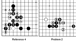 Reference 1: In response to black 1 (41 in Diagram 3), white 2 is a tsuke-koshi in combination with white 4. If Black tries to stop White's escape with 5 and 7, he runs into trouble after white 8, 10 and 12. If Black plays at A, white B sets up either C or D. Black cannot defend against both threats.
