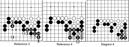 Reference 4: Black 2 seems good, but the placement at 3 is a strong move. If Black connects with 4, White would play the tsuke-koshi combination 5 and 7, and 11 would give him life. Again Black has failed.